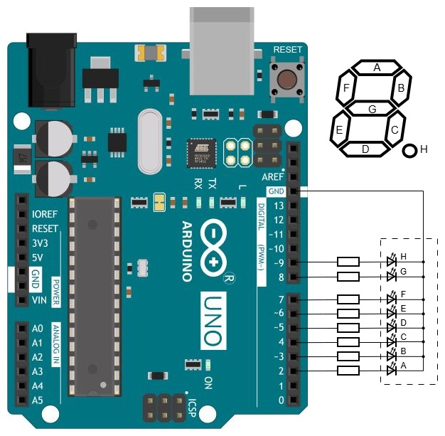 Задача — реализовать два режима отображения принятых из терминала данных на подключённом к Arduino UNO семисегментном индикаторе с общим катодом. В первом режиме передаётся и отображается цифра 0-9, во втором в виде строки нулей и единиц передаётся схема отображения произвольного знака (комбинация сегментов). Переключение режимов и передачу данных выполнять в строках вида параметр=значение.