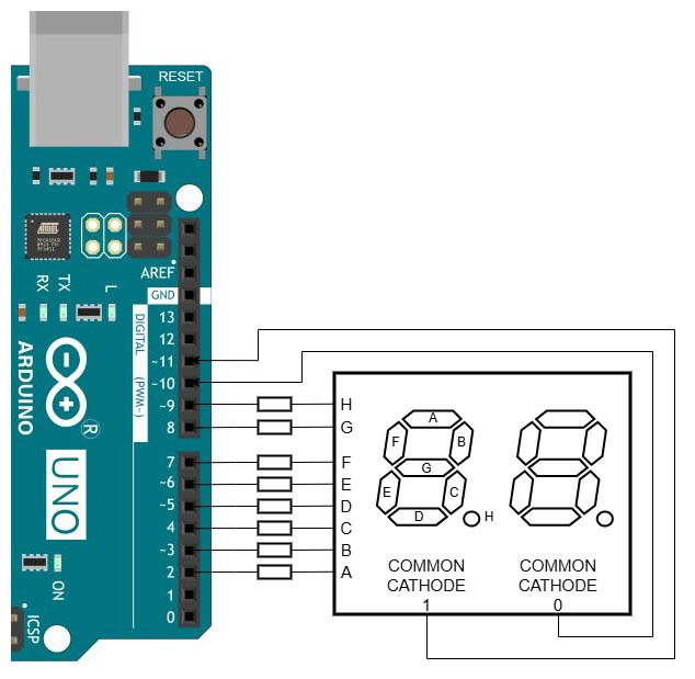 Сегментные линии индикатора, как и в предыдущих этюдах, подключены к пинам 2-9 Ардуино, а общие электроды, в отличие от предыдущих этюдов, не к линиям GND или +5 В, а к пинам 10 и 11, то есть потенциалом на общих электродах тоже можно управлять. Выставив на общем электроде разряда надлежащий уровень (например, высокий на общем катоде), можно этот разряд погасить. В разряде, на общем катоде которого низкий уровень, будет отображаться знак, заданный комбинацией уровней на сегментных линиях.