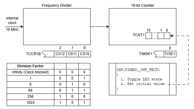 На чертеже показана конфигурация, использующая Таймер 1 с учётом сказанного. Внутренний тактовый сигнал 16 МГц поступает на вход делителя частоты, коэффициент деления которого задаётся тремя младшими битами регистра TCCR1B. Выходной сигнал делителя поступает на вход 16-разрядного счётчика, в регистр TCNT1 которого записано начальное значение N0. Счётчик считает поступившие на его вход перепады, и каждый раз, когда досчитывает до 65535 и переполняется, (1) сбрасывается; и (2) генерирует прерывание по переполнению, если это разрешено битом TOIE1 в регистре TIMSK1. Получив запрос прерывания, микроконтроллер выполняет программу обслуживания прерывания (Interrupt Service Routine) ISR(TIMER1_OVF_VECT), в которой управляет светодиодом и записывает N0 в счётчик.