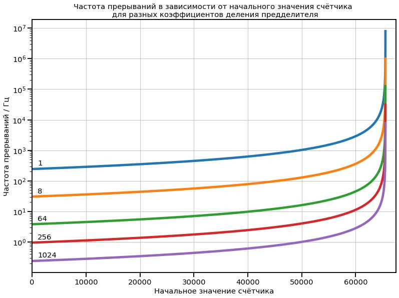 (N0 — начальное значение, k — коэффициент деления). Зависимость частоты прерыаний от начального значения при разных коэффициентах деления показана на графике: